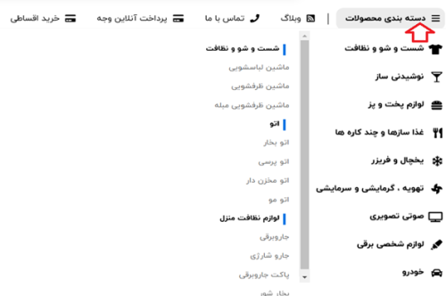 2. همچنین می توانید از منوی “دسته بندی کالا” وارد دسته بندی های فروشگاه شوید و کالای مورد نظر خود را از طریق دسته بندی های موجود انتخاب نمایید